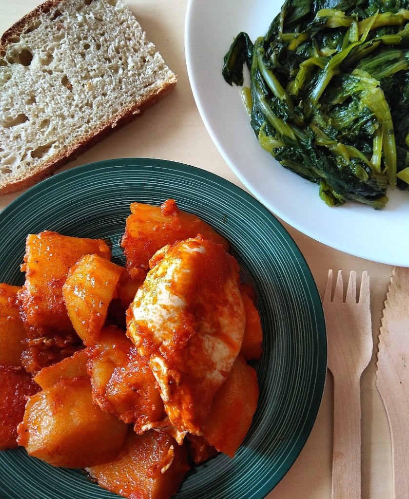 Με ένα πιρούνι, «τσιμπάμε » τις πατάτες να δούμε αν είναι έτοιμες, το φαγητό μας . Όταν οι πατάτες έχουν μαγειρευτεί καλά και το φαγητό μας έχει αρκετή σάλτσα (αν η σάλτσα έχει ήδη δέσει την αραιώνουμε με λίγο νεράκι ακόμα που έχει βράσει), σπάμε τα αβγά μας σε διαφορετικά σημεία της κατσαρόλας αφήνοντας μια μικρή απόσταση μεταξύ τους , και κλείνουμε με το καπάκι της κατσαρόλας και συνεχίζουμε τον βρασμό μέχρι να μαγειρευτούν.