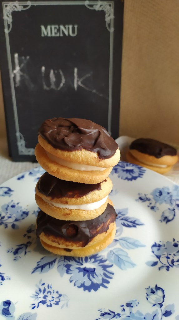 Μόλις κρυώσουν καλά τα δισκάκια από παντεσπάνι και σιροπιαστούν, γεμίζουμε με την σαντιγί ανα δυο παντεσπάνια και τα αφήνουμε να σταθούν. Τα βάζουμε σε καραμελόχαρτα και τα διατηρούμε στο ψυγείο