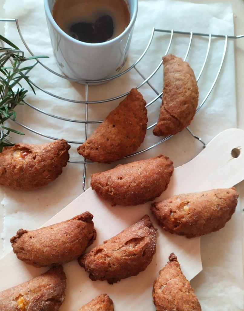 Με έναν κοινό πλάστη, ανοίγουμε την ζύμη μας σε φύλλο 5 χιλιοστών , και με την βοήθεια ενός ποτηριού ή κουπατ κόβουμε μικρούς δίσκους. στο κέντρο κάθε δίσκου, βάζουμε ενα κουταλάκι του γλυκού μίγμα τυριων . Κλείνουμε ενώνοντας τις ακρες απο τα πιτάκια, σχηματίζοντας ένα μισοφέγγαρο. Ψήνουμε σε αντικολλητικό χαρτί , για 15-20 λεπτά στους 180 βαθμούς αέρα