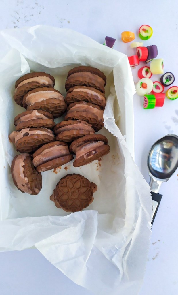 Βγάζουμε το παγωτό μας, που σε αυτό το στάδιο τρώγεται και σκέτο και με ένα κουταλάκι, βγάζουμε απο το μίγμα, και το τοποθετούμε πανω σε ένα μπισκότο. Κλείνουμε με άλλο ένα μπισκότο και πιέζουμε ελαφρώς μέχρι να δημιουργηθεί το σάντουιτς. Επαναλαμβάνουμε για όλα τα ζευγάρια μπισκότων . Διατηρούμε σε κλειστό δοχείο στην κατάψυξη για να μείνουν όσο πιο τραγανά γίνεται