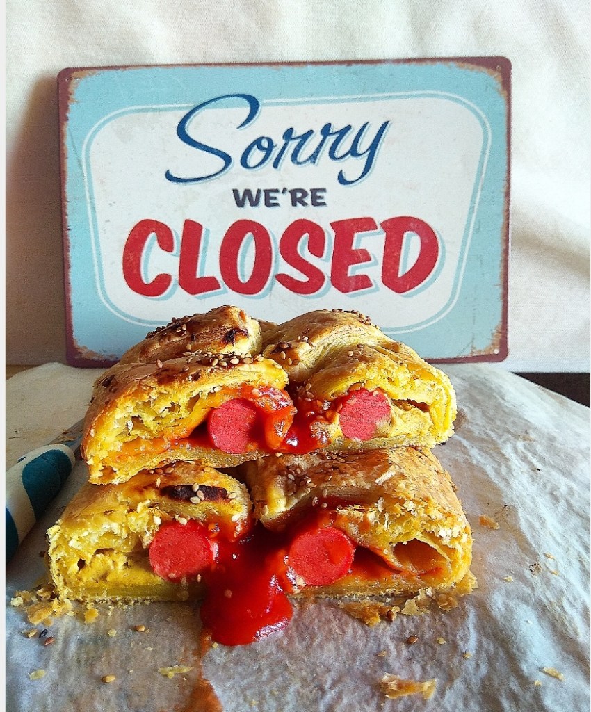 Πάνω από τις σως ξαπλώνουμε τα λουκάνικα μας. Τυλίγουμε από έξω προς τα μέσα καλύπτοντας με φύλλο τα λουκάνικα και τις σώς μέχρι την νοητή γραμμή ή μέχρι να συναντήσει η μία άκρη την άλλη. Αυγωνουμε και πασπαλίζουμε με το σουσάμι