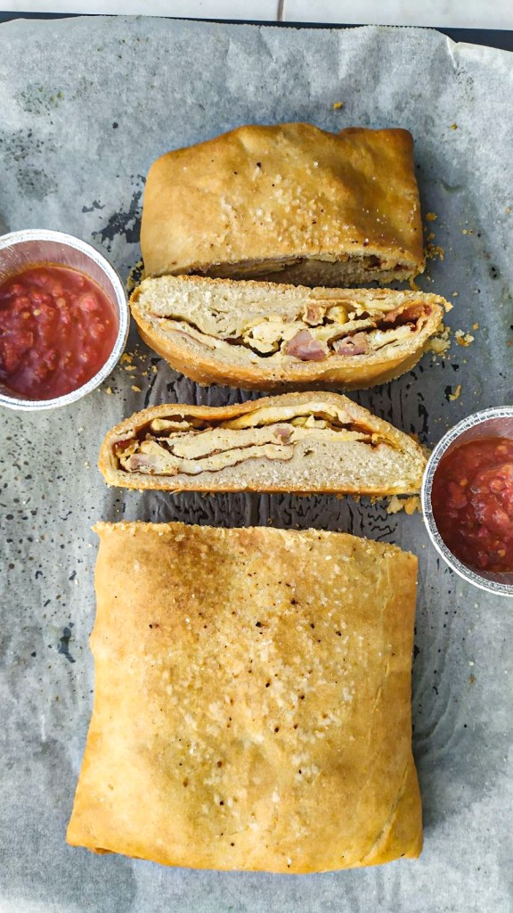 Σε ένα αλευρωμένο πάγκο και με την βοήθεια ενός πλάστη ανοίγουμε το ζυμάρι μας όχι πολύ ψιλό πάχους περίπου ενός δάχτυλου. Τοποθετούμε το ζυμάρι μας σε ένα ταψί σε λαδόκολλα. Στη συνέχεια βάζουμε την ομελέτα πάνω στο ζυμάρι και διπλώνουμε το ζυμάρι μας σαν φάκελο. Σε προθερμασμένο φούρνο στους 180 βαθμούς στον αέρα βάζουμε το ταψί με την πίτα μας και αφήνουμε να ψηθεί για περίπου 20 λεπτά (ανάλογα με τον φούρνο). Μόλις ροδίσει είναι έτοιμο!