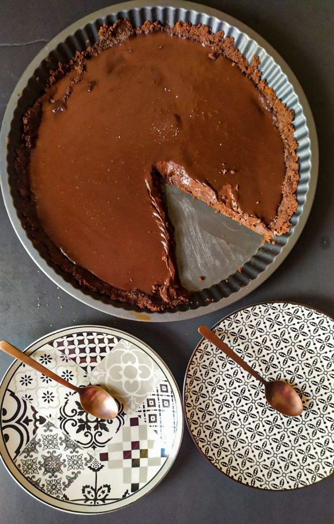 Περιχύνουμε την ganache στο μίγμα στην ταρτιέρα και με την βοήθεια μιας σπάτουλας ή μια μαρίς απλώνουμε απαλά σε όλη την επιφάνεια. Βάζουμε την τάρτα στο ψυγείο για ένα μισάωρο. Έτοιμη!