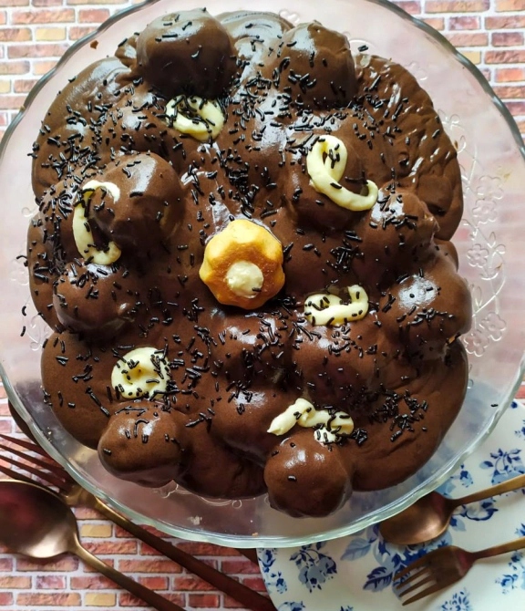 Σε ένα πιάτο ή ένα μπώλ στρώνουμε το 1/3 της κρέμας κακάο . Στρώνουμε από πάνω μερικά από τα γεμισμένα σού . Επαναλαμβάνουμε με κρέμα σοκολάτας και σου μέχρι να τελειώσουν τα μίγματα. Ψύχουμε για 2-3 ώρες και απολαμβάνουμε.