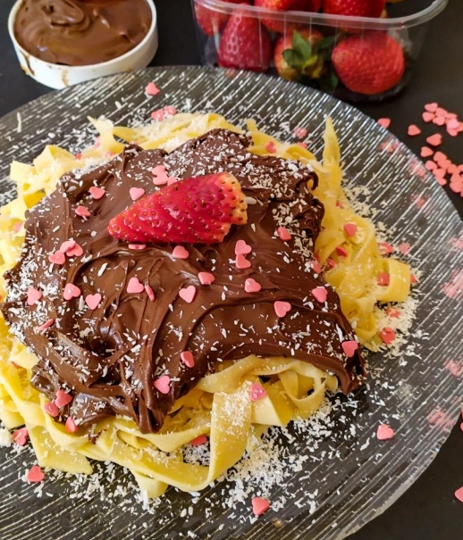 Ας μιλήσουμε για την σοκομακαρονάδα που φτιάξαμε και σας παρουσιάζουμε για την γιορτή του Αγίου Βαλεντίνου. Πρόκειται για ένα νέο food trend, που μας έρχεται από τα εστιατόρια της Νέας Υόρκης αλλά συναντάμε και εδώ τελευταία. Πρόκειται για μακαρονάδα στην όψη , όπου τα ζυμαρικά μας φτιάχνονται με φύλλα κρέπας και η σάλτσα μας είναι σοκολάτα ή πραλίνα φουντουκιού. Για το εφέ του τυριού χρησιμοποιήσαμε τριμμένη καρύδα . Πάμε να δούμε υλικά;