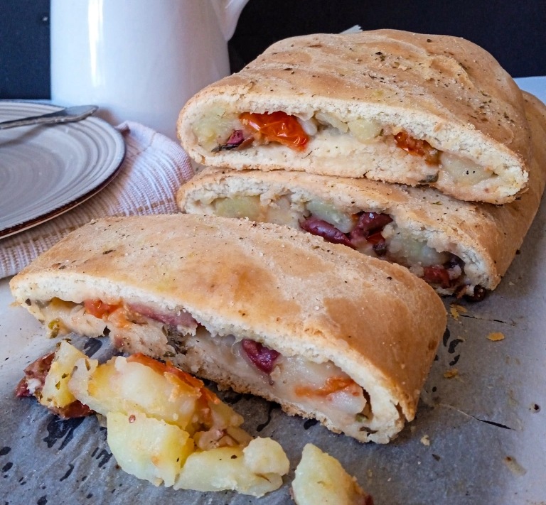 Αλευρώνουμε τον πάγκο μας και ανοίγουμε την ζύμη μας σε φύλλο πάχους ενός εκατοστού . Αφήνουμε τρία εκατοστά απο την πάνω μεριά και άλλο τόσο απο την κάτω και στο κέντρο τοποθετούμε την γέμιση μας κατά μήκος . Κλίνουμε με την υπόλοιπη ζύμη αγκαλιάζοντας και την γέμιση. ενώνουμε με λίγο λάδι και γυρνάμε το ρολό μας (να πάνε απο την κάτω μεριά οι εγκοπές), σε μία λαδόκολα
