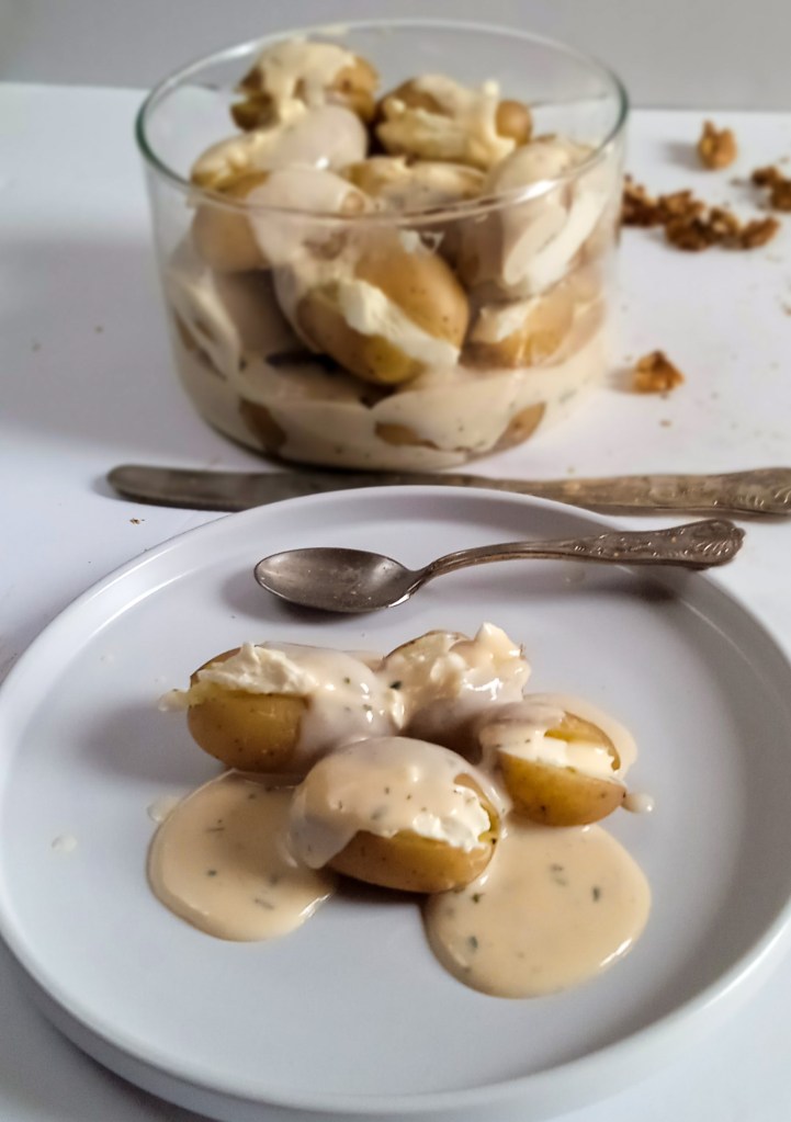 Όσο είναι ζεστές οι πατάτες μας, με την βοήθεια ενός μαχαιριού τις κόβουμε κατά μήκος στα δυο. Στο ένα μέρος της πατάτας, βάζουμε με ένα κουταλάκι τυρί κρέμα και καλύπτουμε με το άλλο κομμάτι πατάτας . Επαναλαμβάνουμε με όλες τις πατάτες.