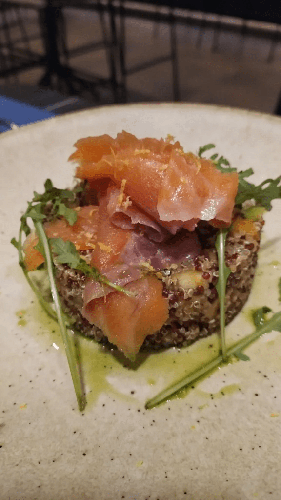 Πρώτα ήρθε η σαλάτα, Με κινόα , ψητή κολοκύθα , μήλο , καπνιστό σολομό και ταχίνι. Κάθε μπουκιά στο στόμα και μια ευχαρίστηση. Η καλύτερη εισαγωγή.