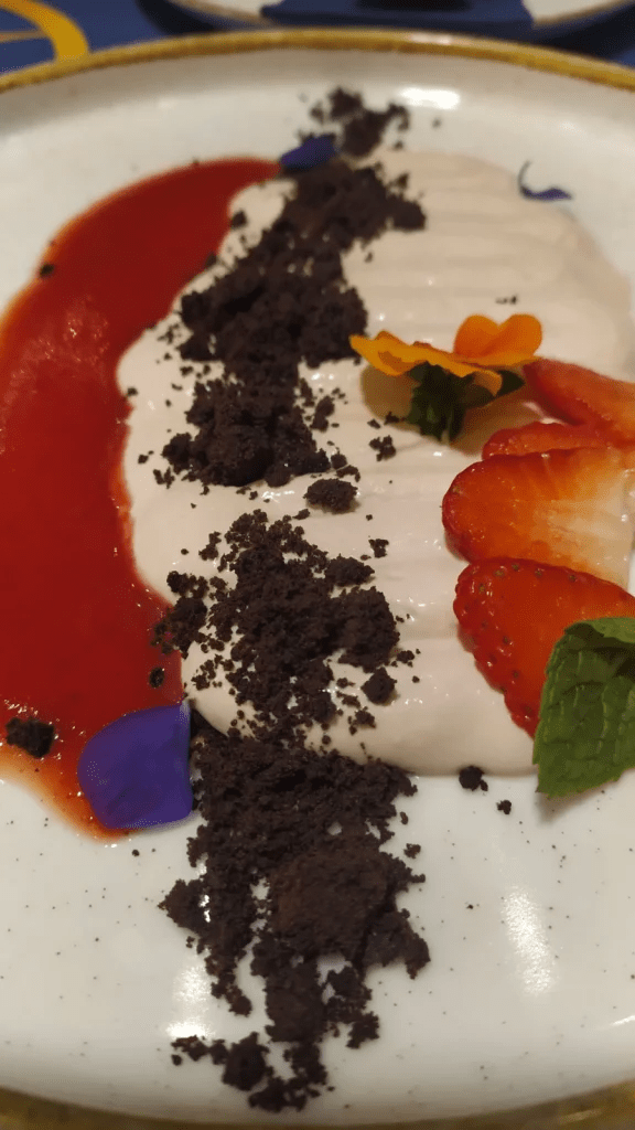 Έχοντας χορτάσει και ευχαριστηθεί και με το παραπάνω το φαγητό και τα coctail μας ήρθε στο τέλος φυσικά και το γλυκάκι για να κλείσει η βραδιά. Cheesecake με πραλίνα , crumble με oreo και coulis φράουλας. Τόσο γλυκό όσο έπρεπε και στην σωστή ποσότητα.