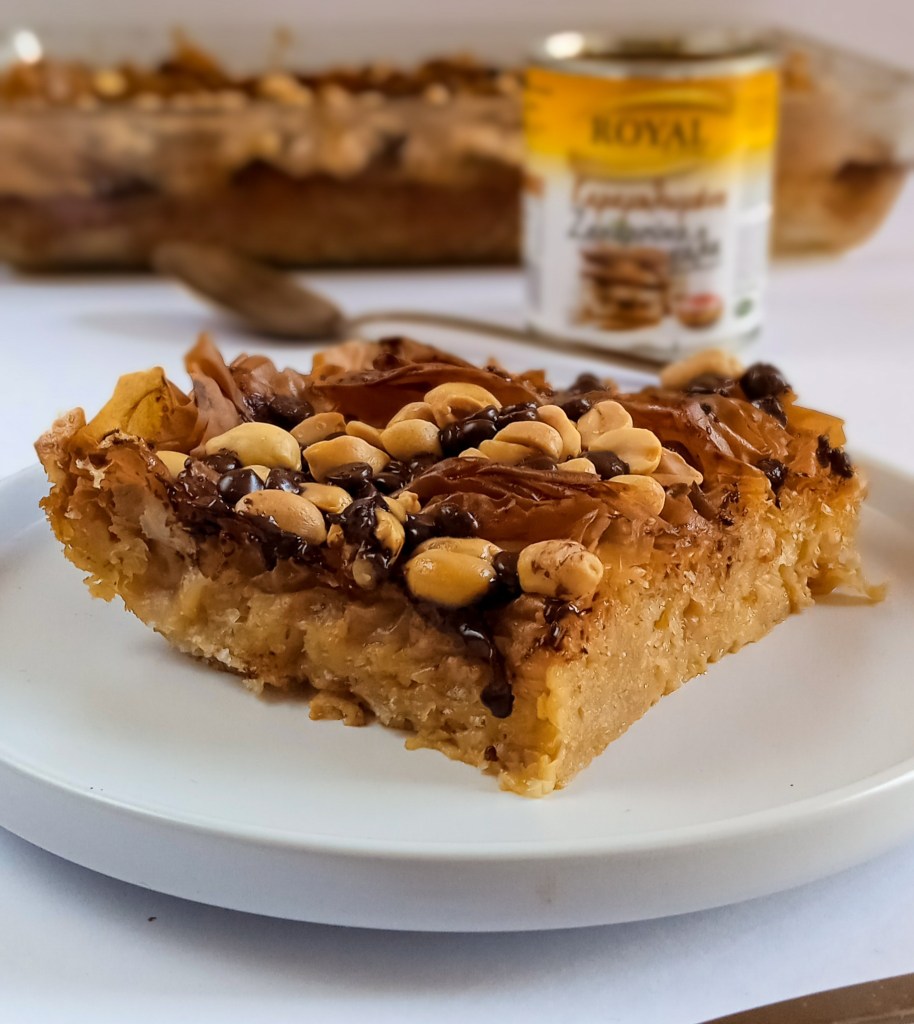 Μόλις ψηθούν τα φύλλα, περιχύνουμε με το μίγμα γάλακτος και ξαναψήνουμε για περίπου ισο χρόνο με την αρχική μας βάση. (15 – 20 λεπτά). Στα δέκα λεπτά ψησίματος ανοίγουμε τον φούρνο και προσθέτουμε τα φυστίκια και τις ψηφίδες σοκολάτας.