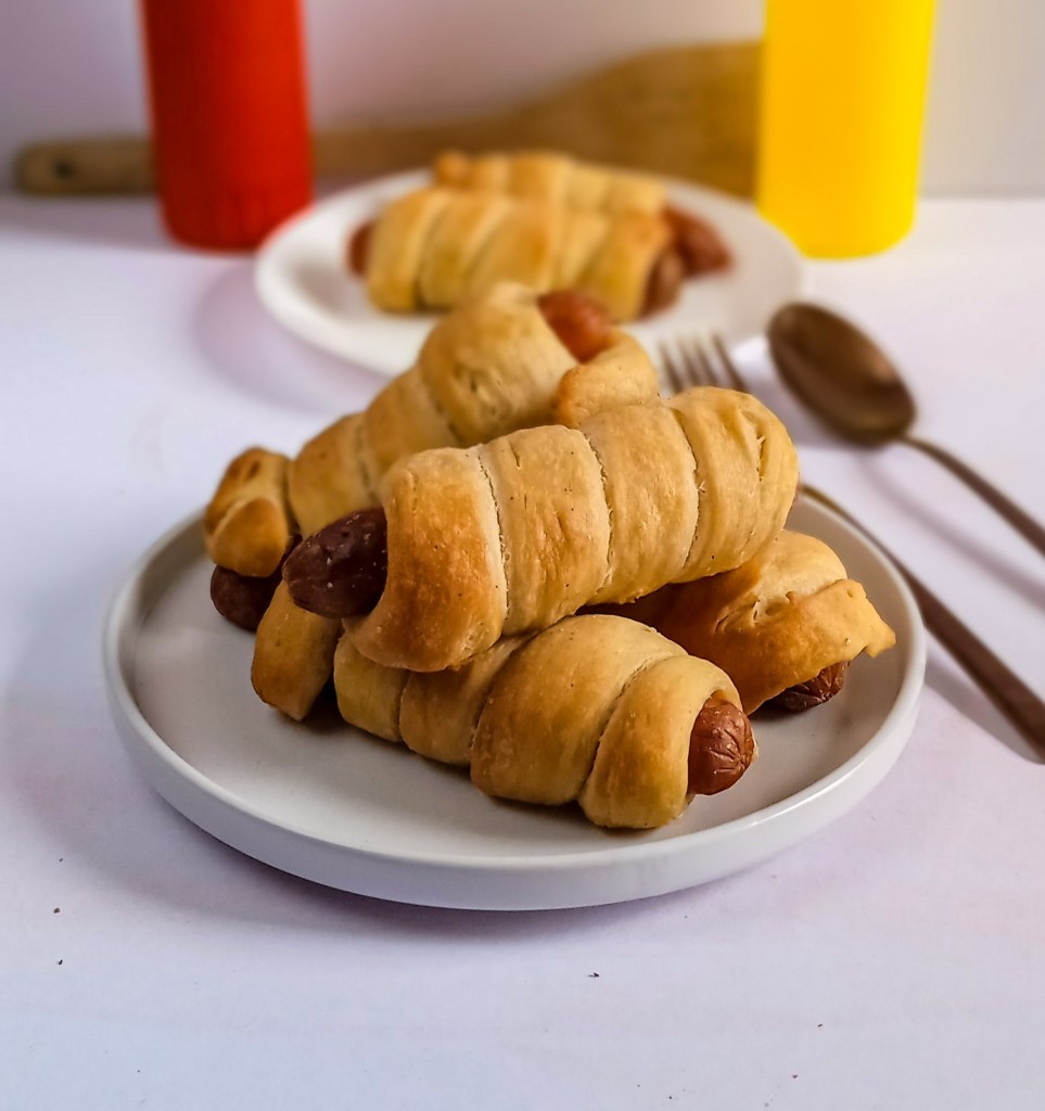 Χωρίζουμε το ζυμάρι μας σε 10 ίσα κομμάτια και τα αφήνουμε ένα τέταρτο. Παίρνουμε το ένα κομμάτι και το ανοίγουμε με τα χέρια μας αρκετά μέχρι να γίνει σαν ένα μακρύ σκοινί, περίπου στο 3πλάσιο του μεγέθους από το λουκάνικο. Τυλίγουμε το κάθε ένα ζυμαράκι γύρω από κάθε ένα λουκάνικο αφήνοντας κενές τις άκρες και τις δένουμε για να μην ανοίξουν.