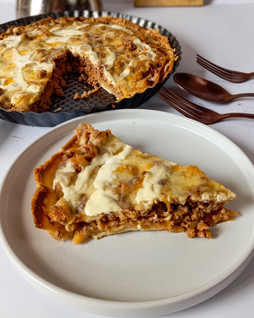 Αφαιρούμε την βάση μας απο τον φούρνο. Ρίχνουμε τον κιμά, πάνω απο την βάση φροντίζοντας να πάει παντού, προσθέτουμε το μπέικον . Ριχνουμε το τυρί και τέλος την κρέμα γάλακτος.