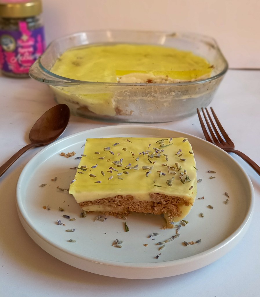 Προσθέτουμε λεβάντα απο πανω. Αν επιθυμούμε πιο λεβαντένια γεύση βάζουμε μερικούς σπόρους και στο γάλα που βράζουμε για την ανθος.